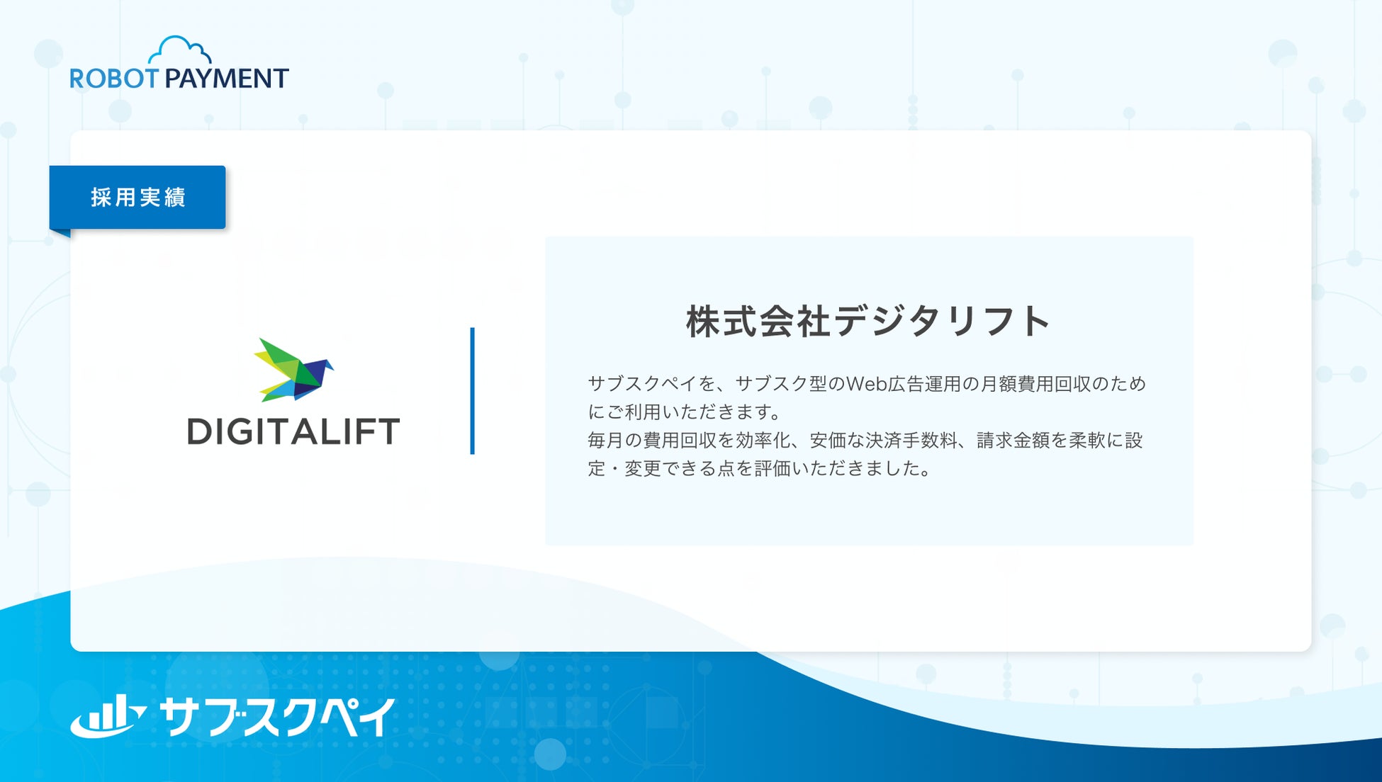 株式会社ROBOT PAYMENT(本社:東京都渋谷区、代表取締役:清久 健也、証券コード:4374、以下「ROBOT PAYMENT」)は、顧客管理・自動課金クラウド「サブスクペイ」が、株式会社デジタリフト(本社:東京都渋谷区、代表取締役:百本 正博、証券コード:9244、以下「デジタリフト」)に導入されたことをお知らせします。