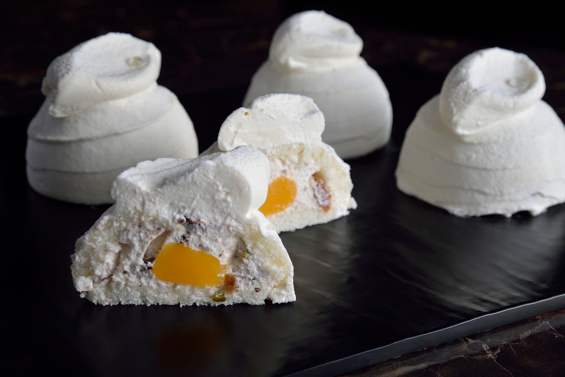 リコッタチーズのカッサータクリームを、卵黄が白い卵と米粉を使用したふわふわの白いスポンジで包み、シャンティクリームを超雲海の雲のように絞り、粉糖で仕上げました。チョコレートやドライフルーツ、ピスタチオ等のナッツを宝石のようにしのばせたカッサータクリームの中には、爽やかな酸味のレモンクリームがほどよく調和し、見た目だけではなく食感でもお楽しみいただけます。