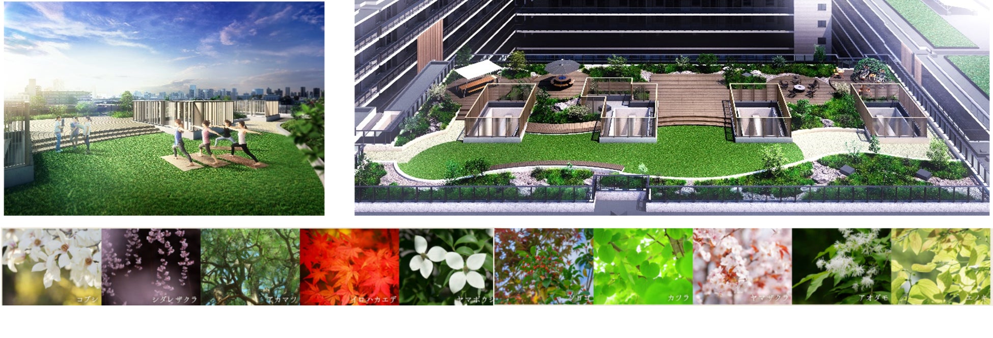 近隣には小石川植物園があるなど豊かな緑に囲まれた文京地区の立地特性を生かし、『都心の杜』をコンセプトに株式会社緑演舎を起用して900㎡超の広さを持つプライベート屋上テラス、近接する街路や寺院の植栽と一体となった植栽計画、本小松石とエリアシンボルである枝垂桜を採用した中庭を計画しています。その他の植栽も、生物多様性の維持につなげ、四季を通して緑に囲まれた潤いある暮らしが送れるよう、緑量の確保、多彩な樹種の配置に配慮した植栽計画としております。その結果として、本物件ではABINCおよびSEGESの2つの環境認証を同時取得いたしました。
