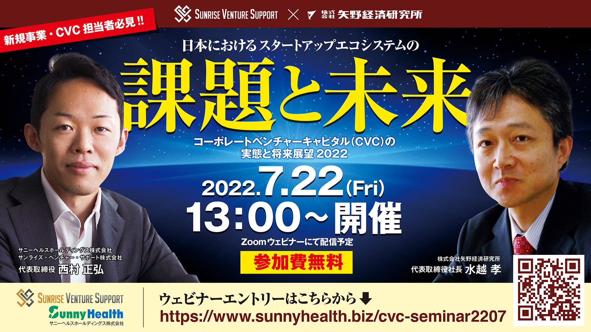 サニーヘルスホールディングス株式会社(本社:長野県長野市、代表取締役:西村正弘、以下:サニーヘルスHD)は、矢野経済研究所より発刊されたCVC白書「日本におけるスタートアップエコシステムの課題と未来・コーポレートベンチャーキャピタルの実態と将来展望2022」を記念してZoomによる無料特別セミナーを2022/7/22(金)13:00より開催いたします。
