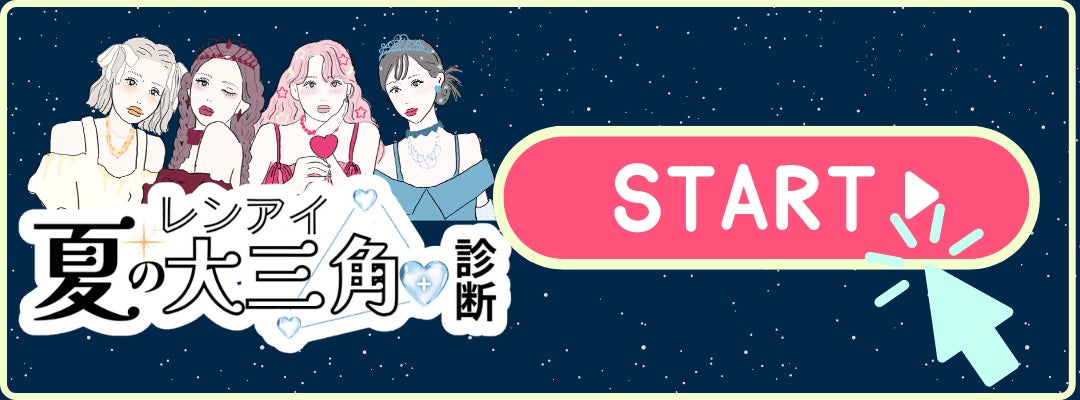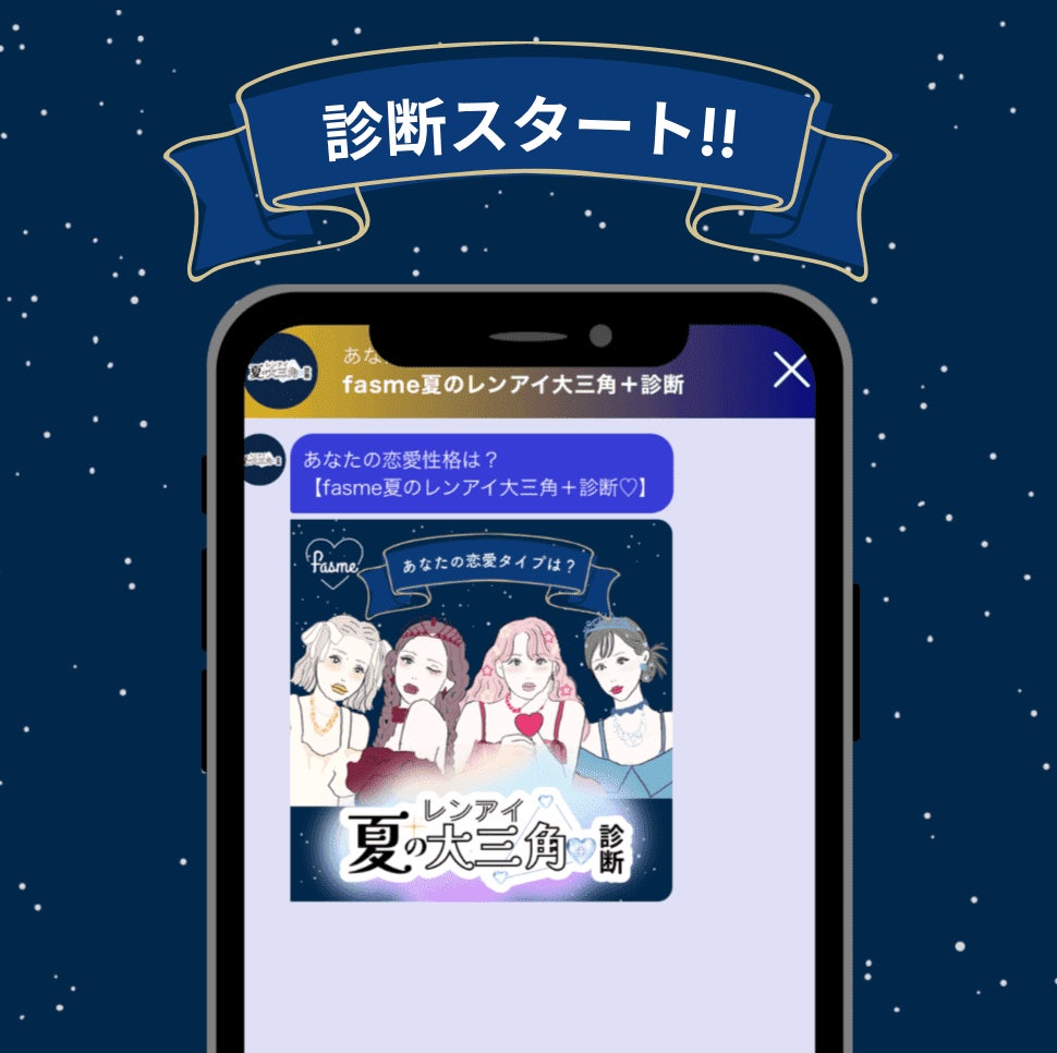 診断は、fasmeウェブサイト内にある「fasme夏のレンアイ大三角+診断♡」記事(https://fasme.asia/diagnosis/renai-daisankaku5760/)から行なえます。記事を開くと、画面の下部に診断のバナーが表示されます。