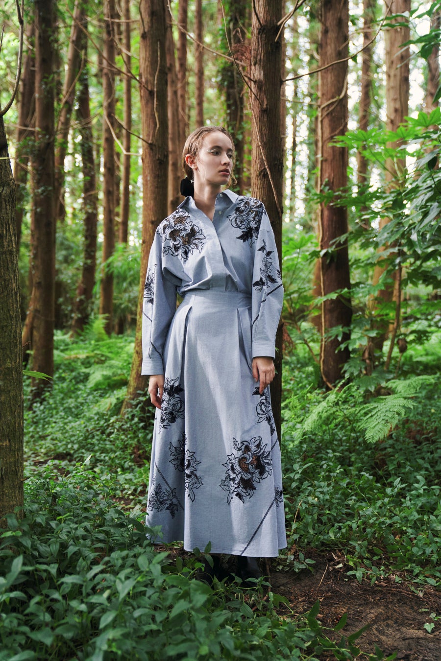 デザイナーが配置の細部にまでこだわったオリジナルのエンブロイダリー生地。