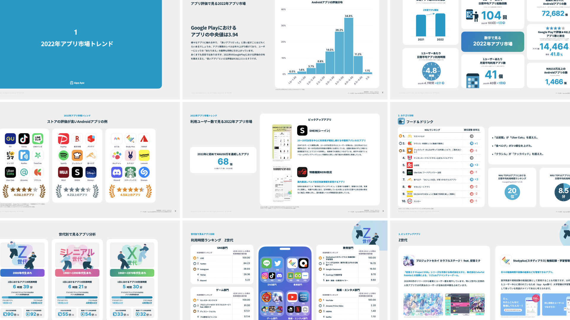 ユーザーが急増したアプリの紹介やアプリレビュー分析、Z世代やミレニアル世代といった世代ごとに支持を集めているアプリ分析など、さまざまな視点でデータを紹介。2022年のアプリ市場の大きな動きを振り返るとともに、アプリを取り巻くユーザーの“いまの姿”を浮き彫りにすることを重視しました。