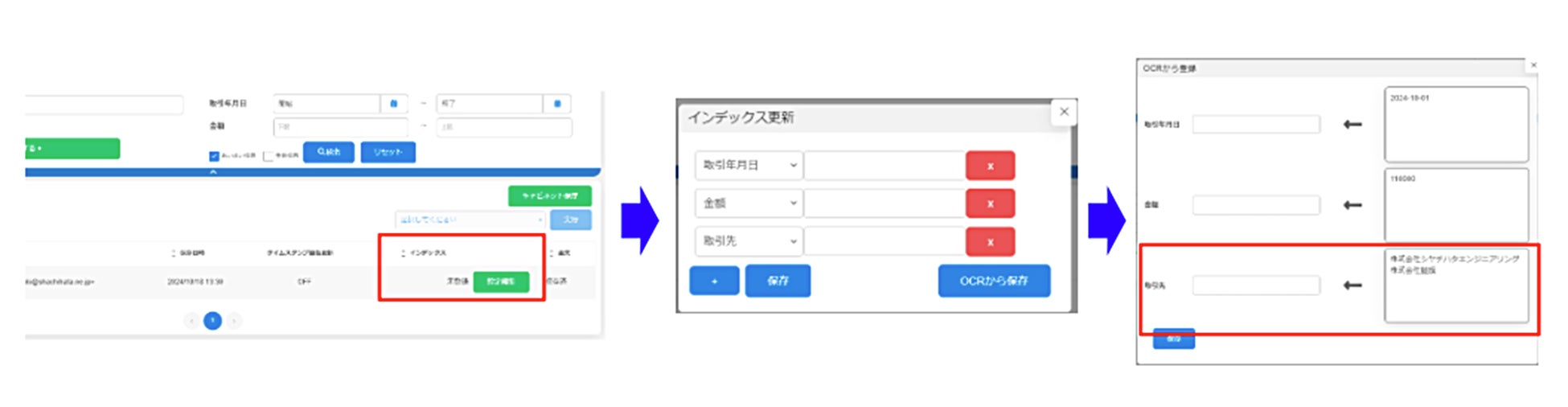 ②「インデックス」設定編集ボタンの「OCRから保存」→「OCRから登録」画面で該当項目の候補文言を選択し、そのまま取引情報の保存が可能