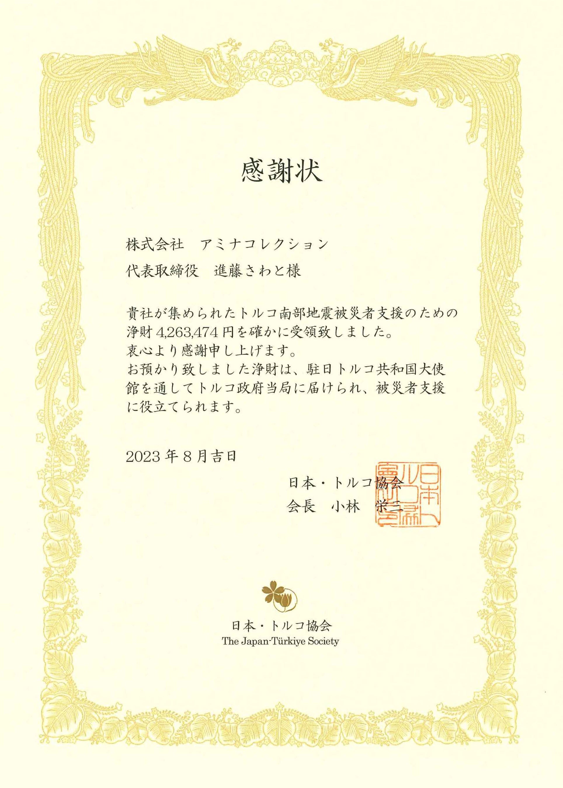 日本・トルコ協会へ2023年7月21日付にて送金。