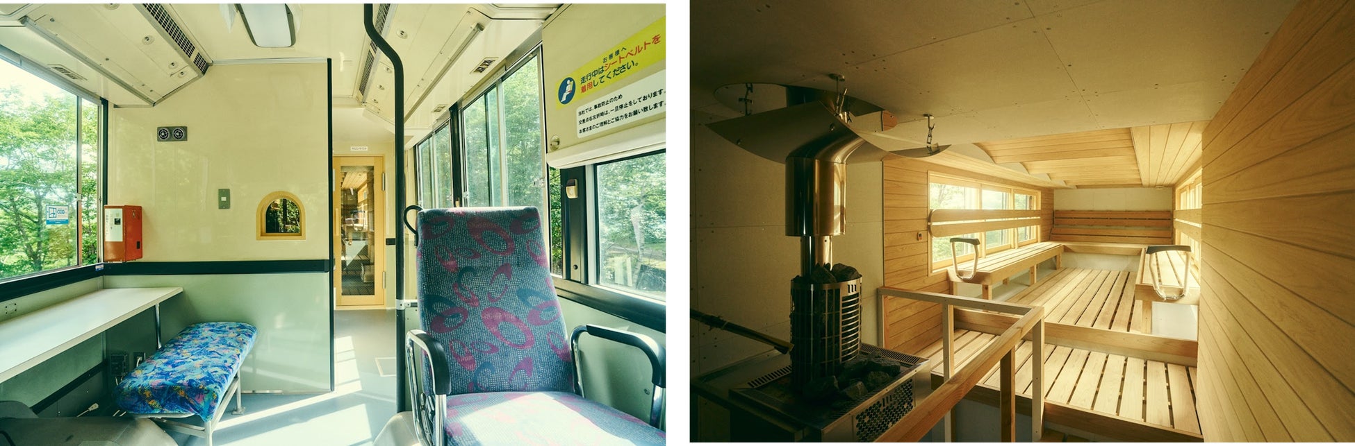 サバス2号のサウナ室は、利用シーンの異なる2つのサウナスペースを用意しています。長年路線バスとして街中を走ってきた雰囲気は残しながら、サバス1号とも異なるサウナ体験ができる空間を目指しました。