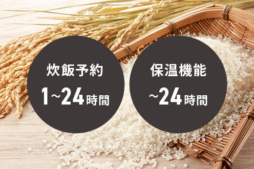 予約炊飯は1〜24時間で設定可能です。保温は24時間可能ですが、5時間程度を目安としてください。