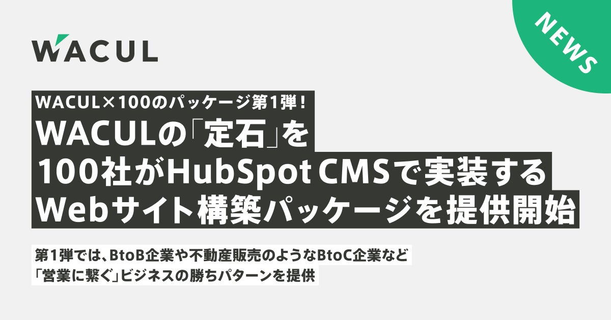 そこで、今年7月に資本業務提携したWACULと100(ハンドレッド)は、WACULが有する事業モデルごとの「デジタルマーケティングの定石」=「勝ちパターン」と、100のHubSpotを活用したCRM/MA領域の設計構築力をかけ合わせ、この度、Webサイトの「定石」をHubSpotの「CMS」機能で実装する共同パッケージの提供を開始することを決定しました。