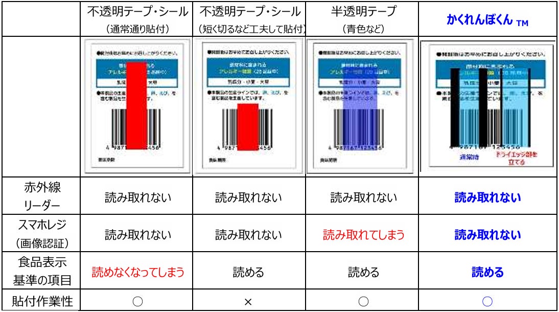 小売業界、特に食品を扱う現場では、値引き販売を行う際に元のバーコードをテープやシールで覆う方法が一般的です。不透明なテープやシールがよく使われていますが、バーコード周辺にある重要な表示内容が隠れてしまったり、表示を隠さないように店員が注意して貼ると、作業効率が落ちてしまうことがあります。この事態を防ぐために、半透明のテープを使用する場合もありますが、店員のいるレジやセルフレジで使用されているバーコードリーダーでの赤外線遮断は可能となる一方、近年普及している顧客自身のスマートフォンで商品をスキャンするスマホレジでは、スマートフォンのカメラで撮影すると読み取れてしまうことが課題となっていました。