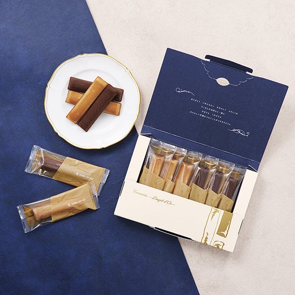 「フィナンシェ ランゴ・ドール」は、一本一本丁寧に焼き上げたフィナンシェのセット。アーモンドとはちみつを使用した〈ナチュール〉と、カカオとゲランドの塩を使用した〈ショコラ〉の2種の味わいが楽しめます。