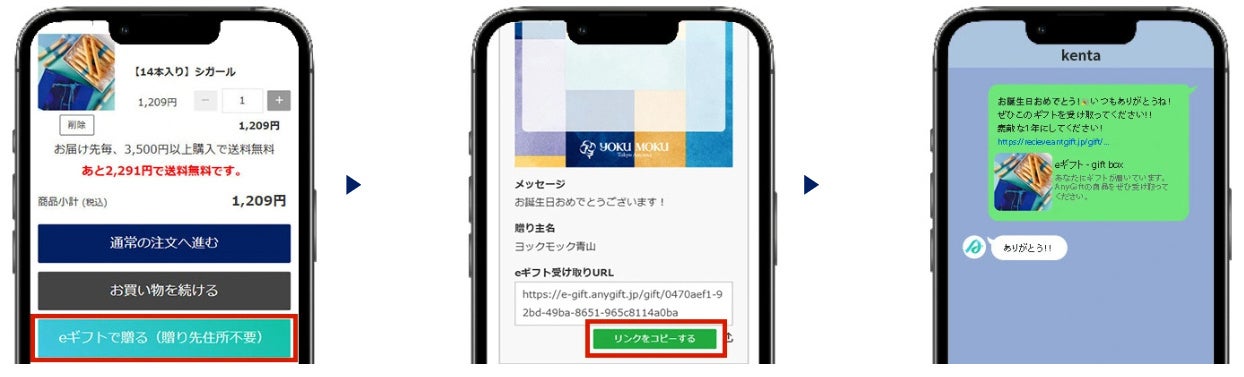 ヨックモック公式オンラインショップで商品を購入し、eギフトを選択すると受け取り用のURLが発行されます。その後、お相手の方にSNS(XやInstagram、Facebook)やLINE、メール等で送信してください。