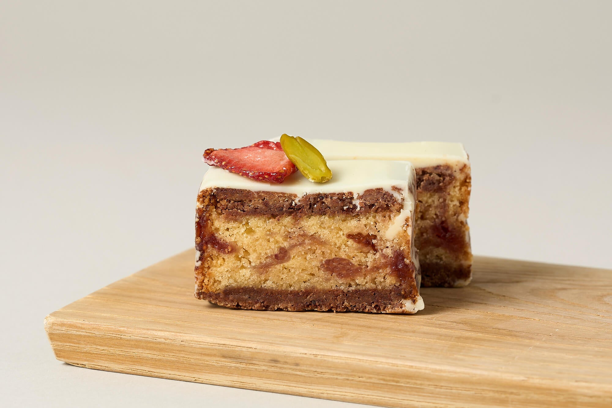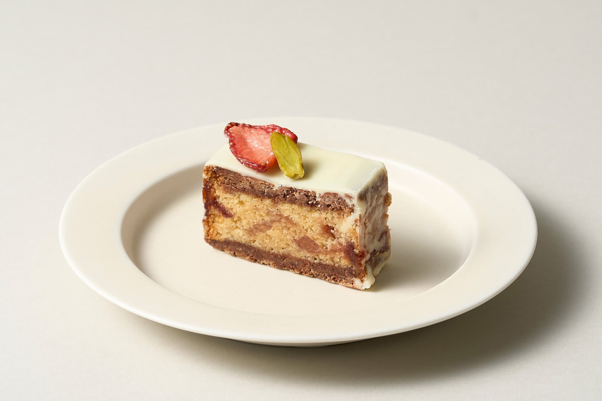 苺の生地の上下には、フルーティなマダガスカル産カカオ豆からお造りしたチョコレートクッキー生地を用いています。苺の風味に寄り添うチョコレートのフルーティな風味と、食感のアクセントをお楽しみください。さらに仕上げにはホワイトチョコレートをかけ、ドライ苺をトッピング。甘酸っぱい苺とチョコレートの相性を存分に楽しめる、見た目も華やかなガトーショコラです。