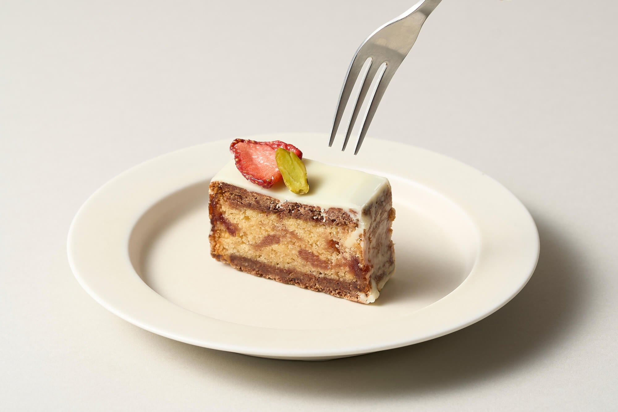 手土産にご好評いただいている、店舗限定の「ガトーショコラ ソフト」シリーズに、バレンタインシーズン限定の苺が登場です。トップにはドライ苺とピスタチオをあしらい、中央の生地にはマーブル状に混ぜた苺を加えた、見た目にも華やかな一品。
