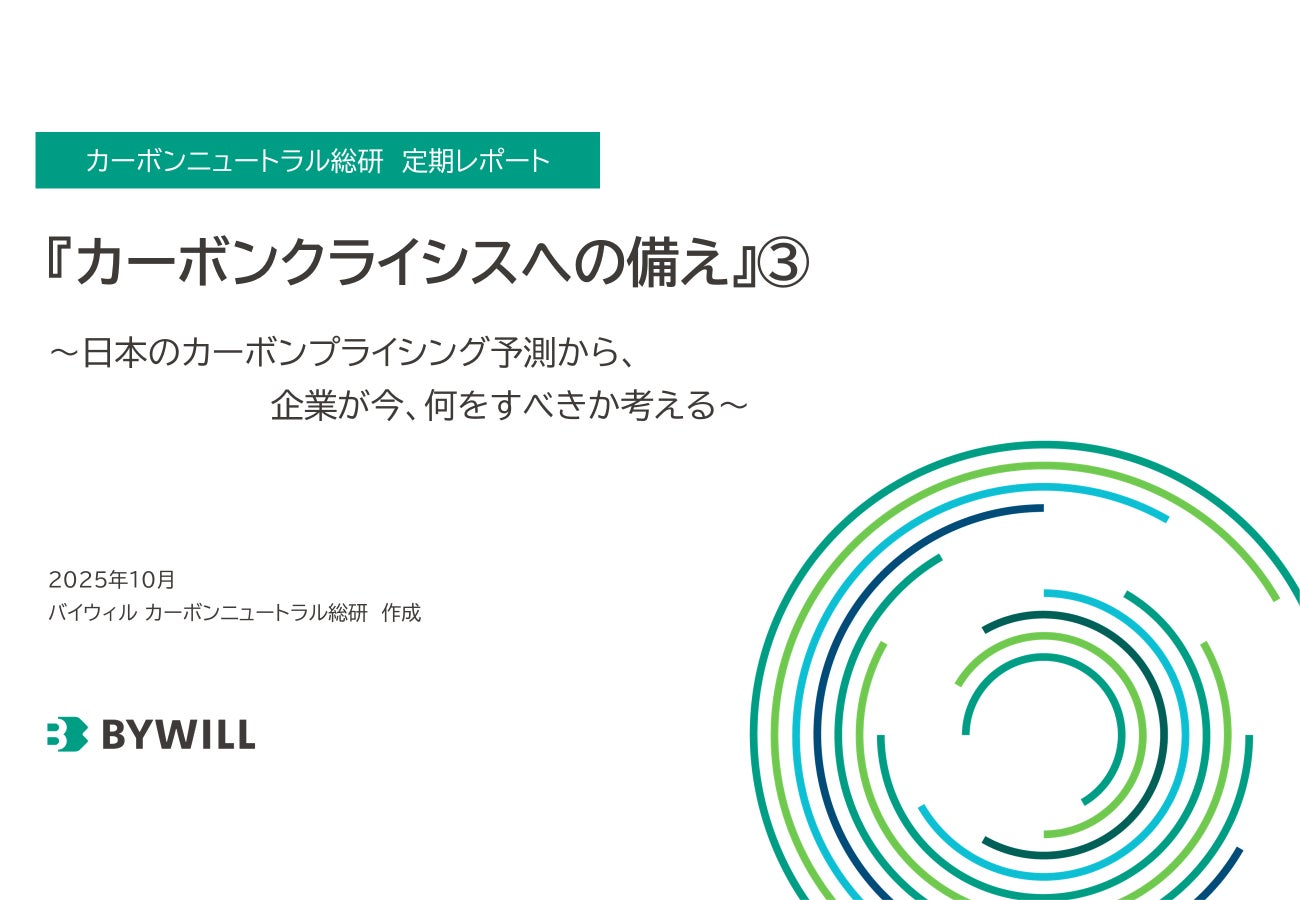 日本全国47都道府県のカーボンニュートラル実現を目指す株式会社バイウィル(本社:東京都中央区、代表取締役社長:下村 雄一郎、以下「バイウィル」)は、2025年10月16日、カーボンニュートラル実現に向けた「脱炭素のセオリー」を構築することを目指して活動する「バイウィル カーボンニュートラル総研」から、『カーボンクライシスへの備え』シリーズ第三弾となるレポートを無料公開したことをお知らせします。