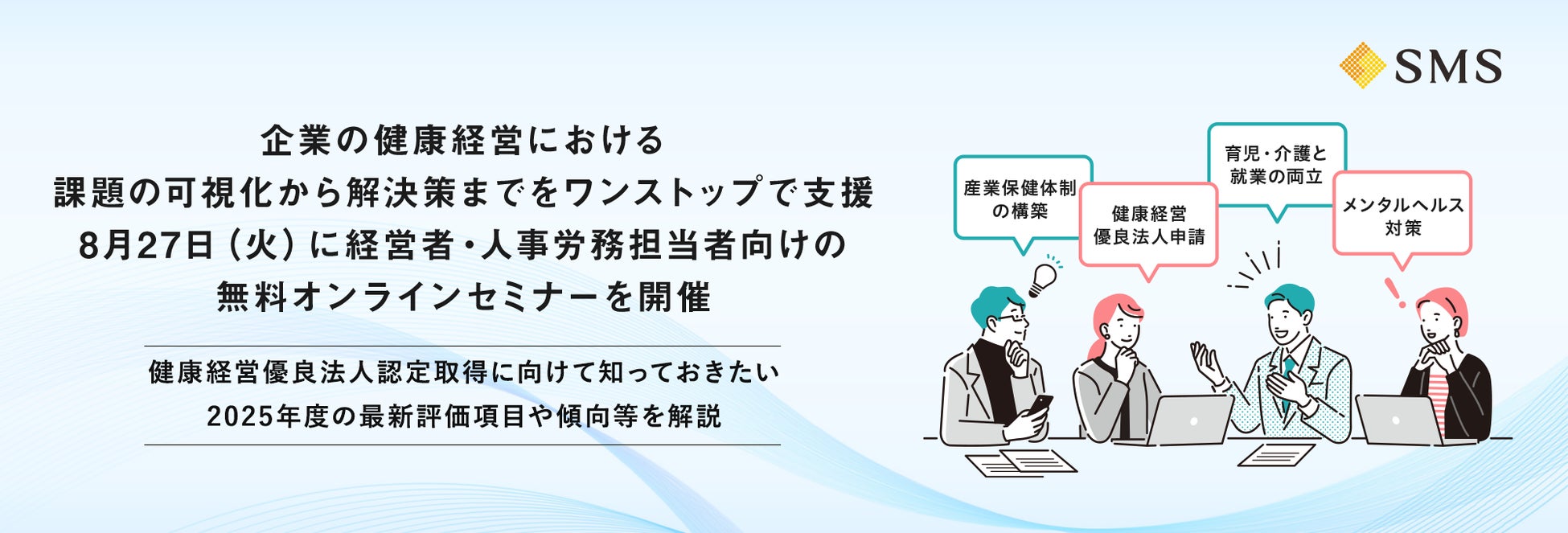 株式会社エス・エム・エス(本社:東京都港区、代表取締役社長:後藤夏樹、東証プライム、以下「当社」)は、企業の経営者・人事労務担当者向け健康経営対策の無料オンラインセミナーを8月27日(火)に開催することをお知らせします。