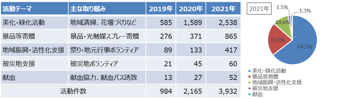 2021年の地域貢献活動の件数は、前年比1,767件増の3,932件となりました。活動内訳は、美化・緑化活動の2,538件が最も多く、次いで景品等寄贈865件、地域振興・活性化支援417件となっております。