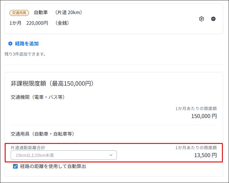 給与計算における通勤手当の非課税計算についても、改正後の非課税限度額に既に対応しています。従業員の通勤経路に交通用具と片道距離を設定していると、片道距離と改正後の非課税限度額に沿って自動計算されるので、お客さまで通勤手当の非課税計算を行う必要はありません。