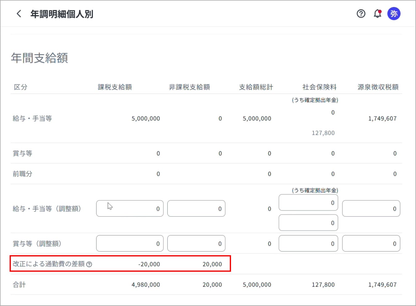 ・改正前後での非課税通勤手当の差額から年末調整での調整額を自動で算出します。