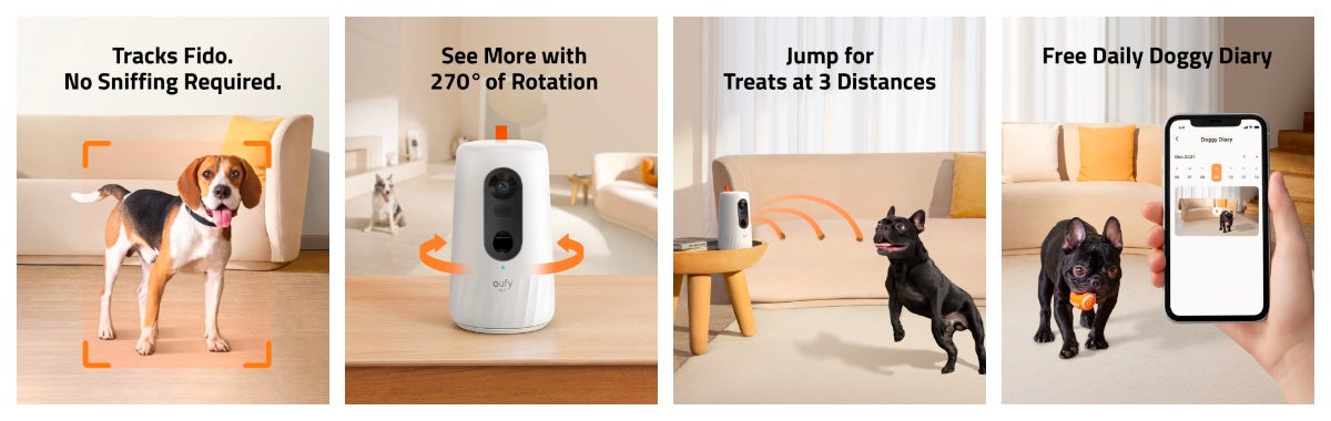 スマートホームブランド「Eufy(ユーフィ)」初のペットカメラ「Eufy Dog Camera D605」を2022年1月27日より販売開始。270°回転可能で、広範囲に動き回る愛犬を自動追尾して見守れる他、アプリを活用して、愛犬が楽しめる「飛び出すおやつ」機能や、呼びかけ機能でコミュニケーションが可能に。離れていてもいつでも愛犬を見守りながらコミュニケーションを取ることができます。