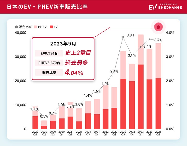 また月別の販売台数では、2023年9月はEV8,994台(史上2番目)、PHEV5,670台(過去最多)となり、軽自動車を含む乗用車の販売台数の4.04%までシェアを伸ばしました。