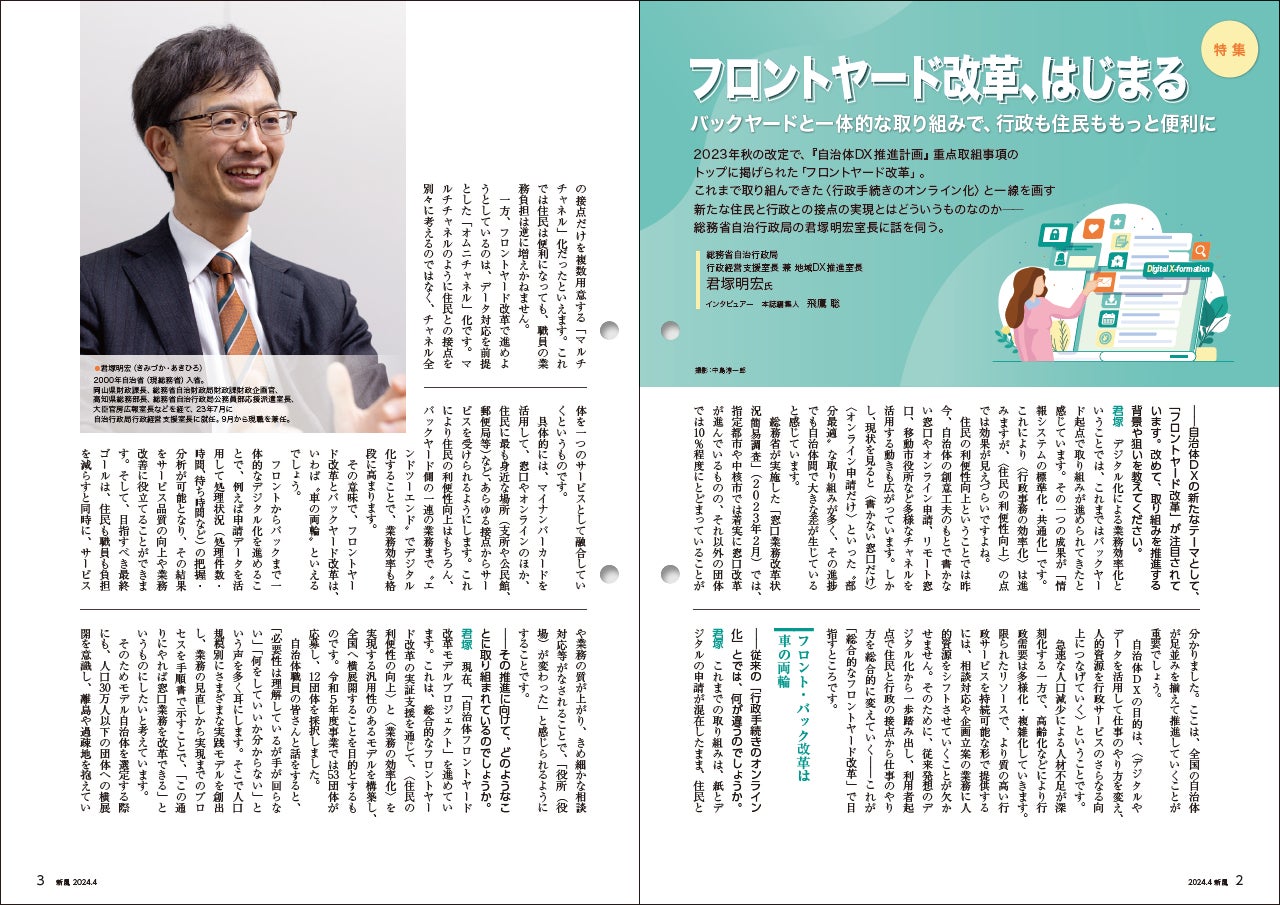本号では、『自治体DX推進計画』重点取組事項のトップに掲げられた「フロントヤード改革」について総務省自治行政局の君塚明宏室長にインタビューしたほか、先進事例として山形県尾花沢市 様と千葉県習志野市 様の取り組みをご紹介。
