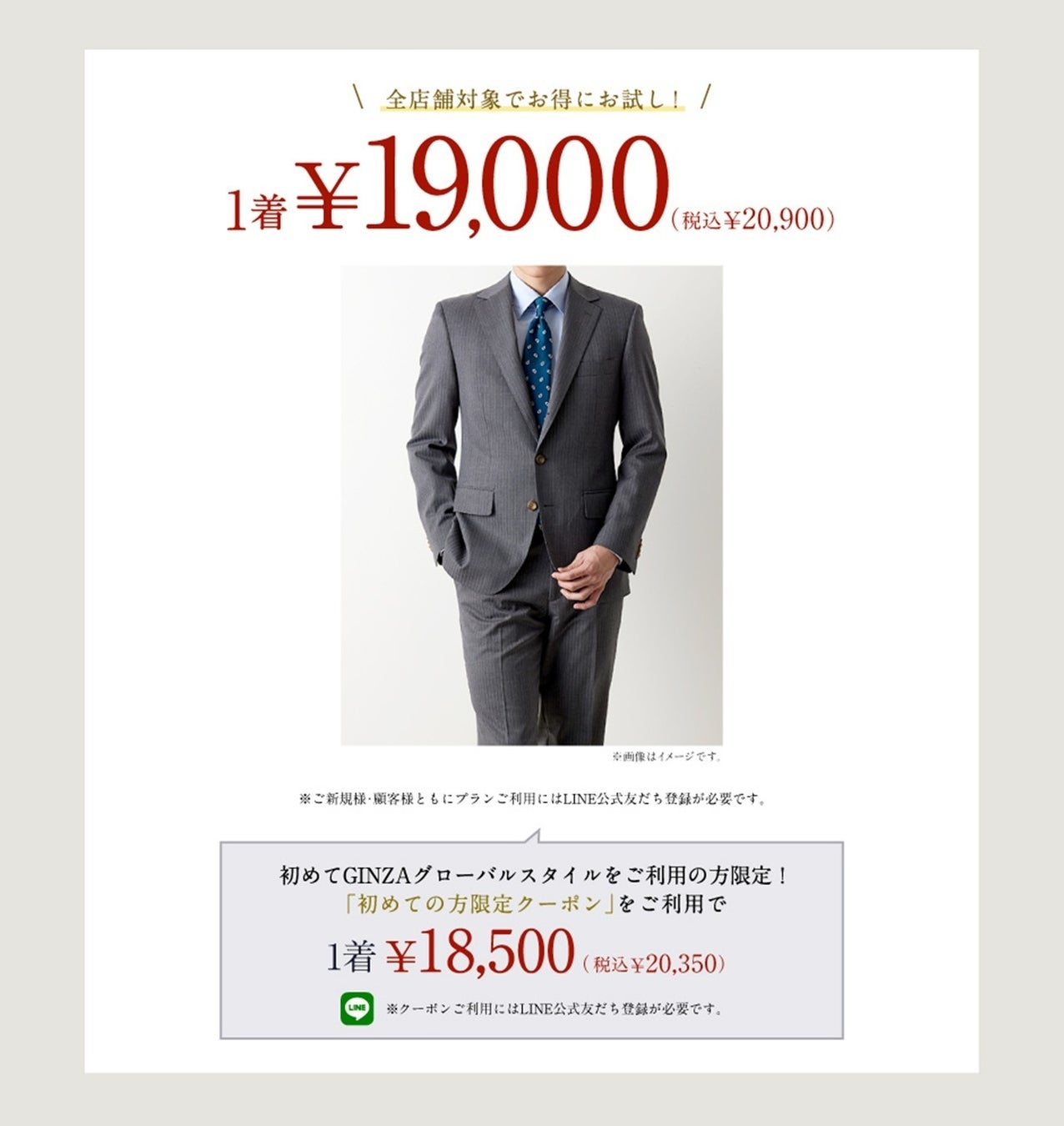 初めてのオーダースーツにも、新しいスーツの購入にも。「グローバルスタイル」でお得な体験を。