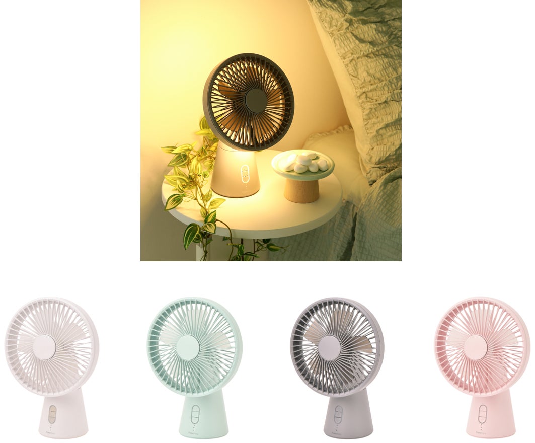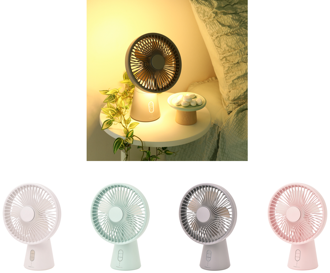 デスク用のコンパクトな多機能ファンです。3段階調光機能付きで枕元のナイトライトとしても活躍します。充電式なのでご自宅のベランダやキャンプなどでもお使いいただけます。3段階風量調節と安心のオートオフ機能を搭載し、左右自動首振り、上下手動調整が可能です。お好みの香りを楽しめるアロマパッド付き。