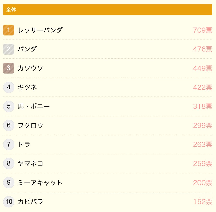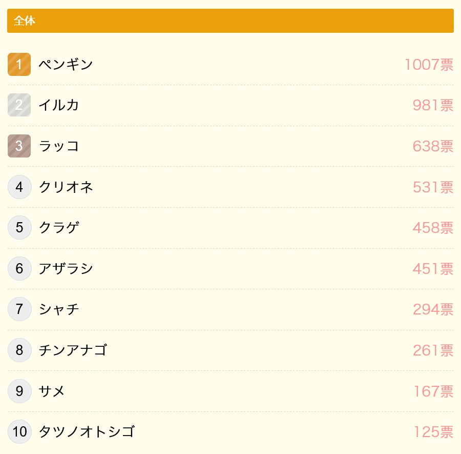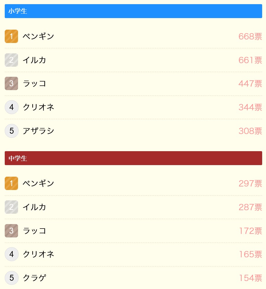 小中学生どちらも上位のランキングは同様で、1位は「ペンギン」、2位「イルカ」、3位に「ラッコ」でした。3位以下に100票以上の差をつけた「ペンギン」と「イルカ」は、小中学生から絶大な人気を得ていることがわかりました。