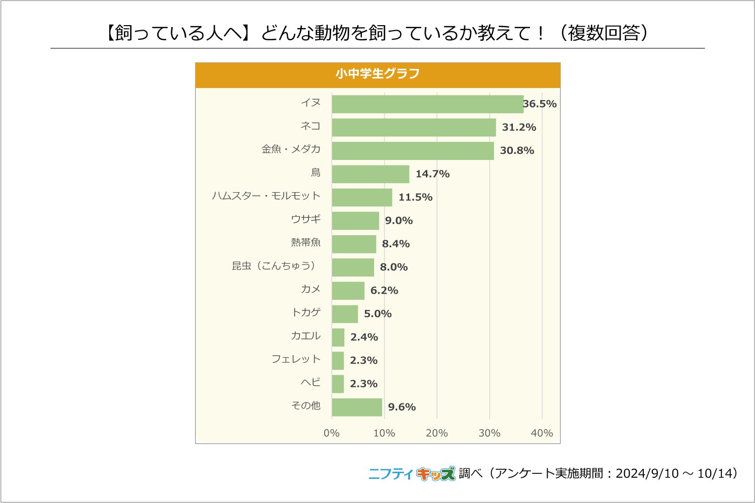 1位は「イヌ」で、次に「ネコ」、僅差で3位に「金魚・メダカ」がランクインしました。「昆虫」や「カメ」、「トカゲ」など、さまざまな種類のペットを飼っていることがわかりました。