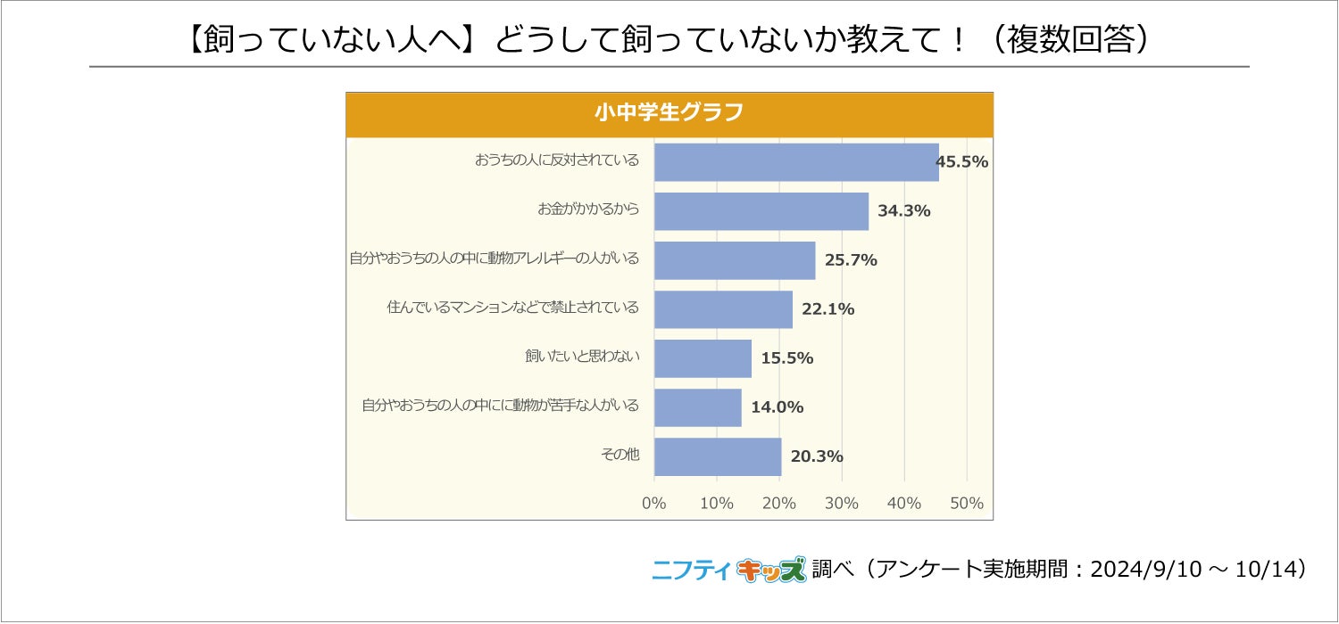 一方で、ペットを飼っていない人は、その理由として「おうちの人に反対されている」をあげる人が最も多く、ほかには「お金がかかるから」や「自分やおうちの人の中に動物アレルギーの人がいる」と答える人もいました。