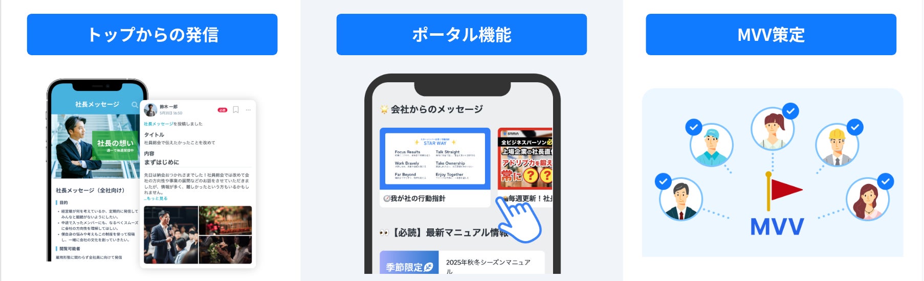 ポータル機能:TUNAG上で従業員に届けたい情報を視認性高く一覧表示することが可能