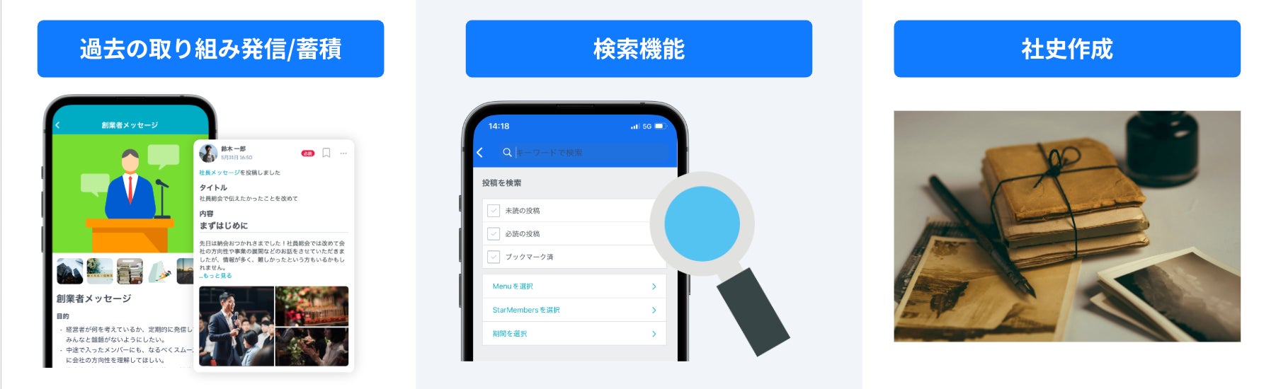 検索機能:歴史の振り返りが可能