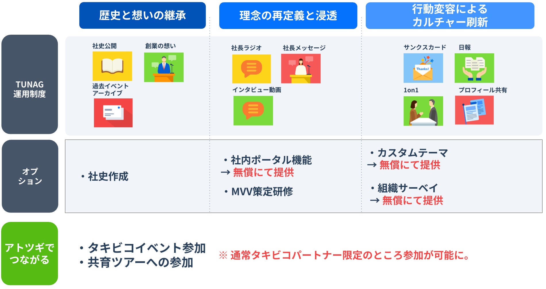 社内ポータル機能 カスタムテーマ 組織サーベイ タキビコイベント参加権(通常タキビコ共創パートナーのみのところ参加可能に) 共創ツアー参加権(通常タキビコ共創パートナーのみのところ参加可能に)