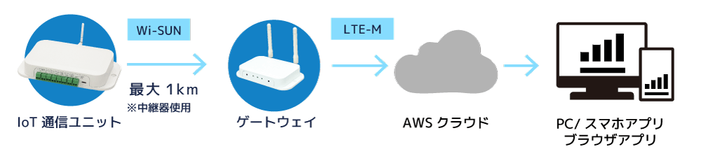 本ユニットは 無電圧接点、RS-485、4-20mA入力、パルス入力 といった産業現場で広く利用されるインターフェイスをサポート。多様な機器やセンサーのIoT化に柔軟に対応します。通信面ではWi-SUNによる中距離伝送に対応し、工場や施設内での安定したデータ収集を実現。さらにゲートウェイを経由しLTE-M回線でクラウドと接続するため、通信設備の追加なく効率的にIoT環境を構築できます。