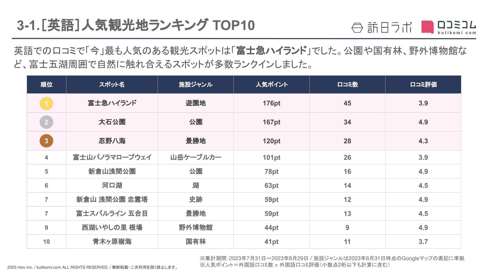 英語での口コミで「今」最も人気のある観光スポットは「富士急ハイランド」でした。公園や国有林、野外博物館など、富士五湖周囲で自然に触れ合えるスポットが多数ランクインしました。