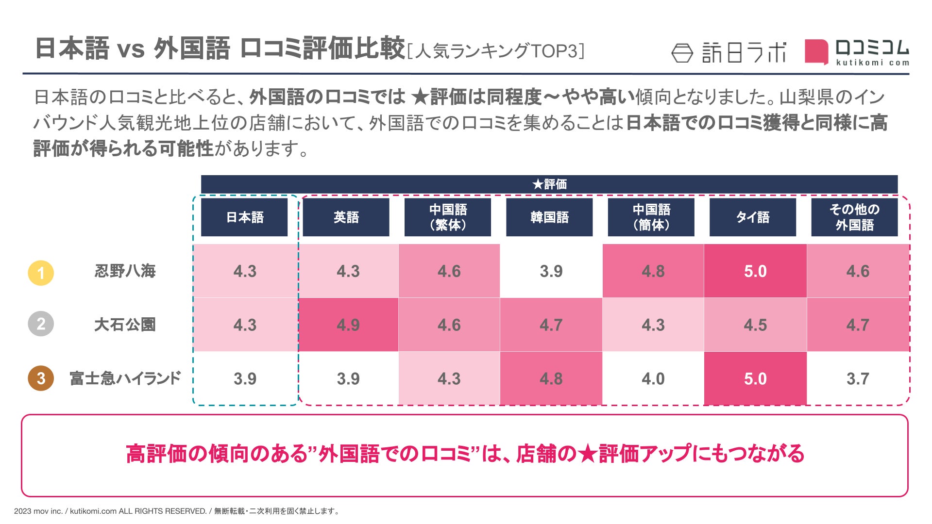 日本語の口コミと比べると、外国語の口コミでは ★評価は同程度〜やや高い傾向となりました。山梨県のインバウンド人気観光地上位の店舗において、外国語での口コミを集めることは日本語での口コミ獲得と同様に高評価が得られる可能性があります。