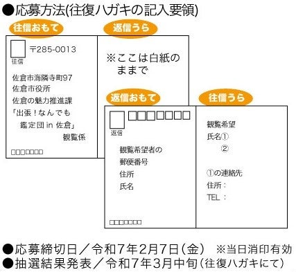 観覧ご希望の方は、往復ハガキに必要事項を記入の上、ご応募ください。(下の図参照)