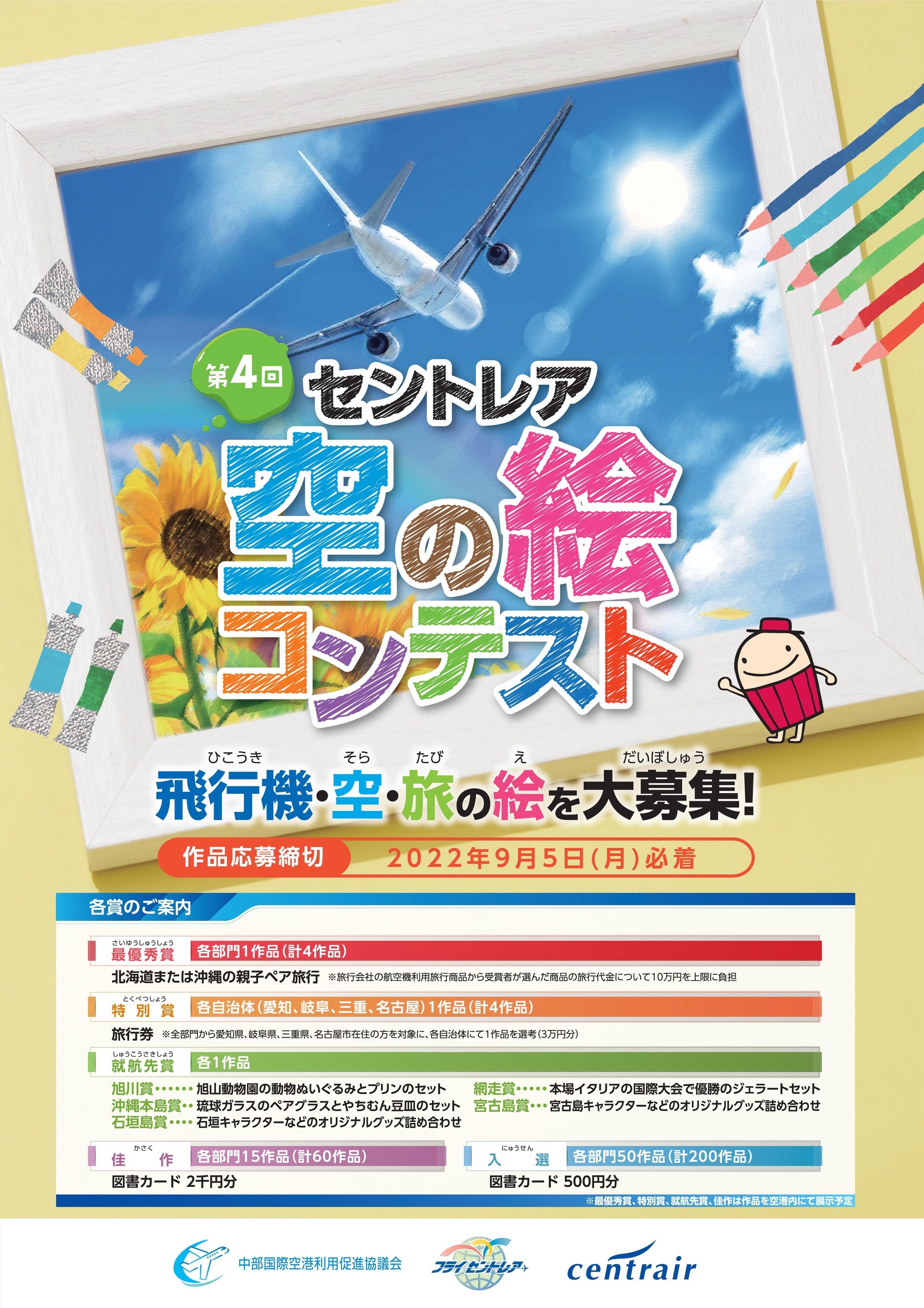 中部国際空港利用促進協議会(構成:愛知県、岐⾩県、三重県、名古屋市、名古屋商⼯会議所、⼀般社団法⼈中部経済連合会、中部国際空港株式会社)は、小・中学生を対象に「飛行機、空、旅」をテーマとした絵画を募集する「第4回セントレア空の絵コンテスト」を 開催いたします。※中部国際空港(所在地:愛知県、以下:セントレア)
