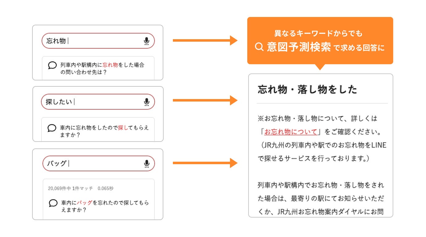 例えば、列車内に鞄を忘れた場合、「忘れ物」「落し物」という検索キーワードが思いつかなくても、「探したい」「バッグ」といったお客さまの欲求を表す言葉から、質問の意図を予測して「忘れ物・落し物」に関する回答ページへと誘導します。