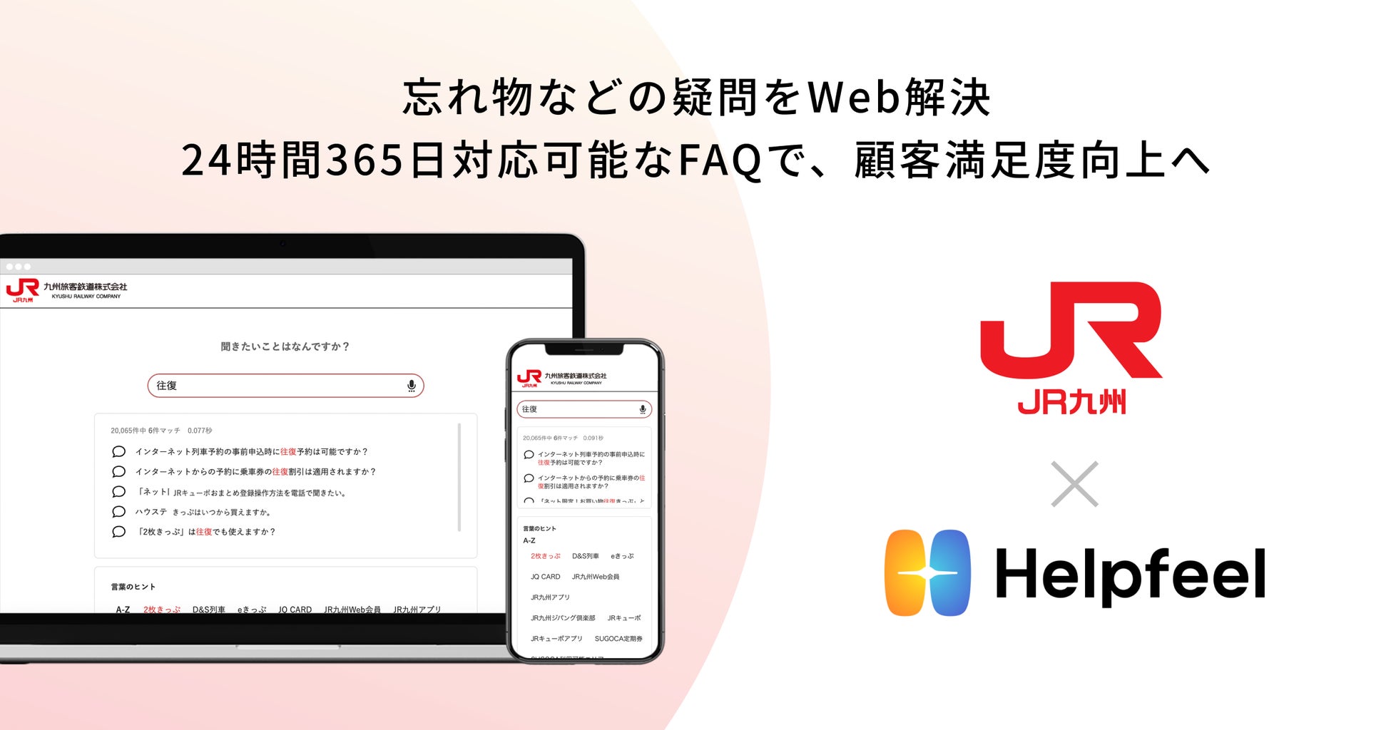 株式会社Helpfeel(京都府京都市、代表取締役/CEO:洛西 一周、以下「当社」)は、九州旅客鉄道株式会社(福岡県福岡市、代表取締役社長 執行役員:古宮 洋二、以下「JR九州」)のWebサイトに、検索型AI-FAQ「Helpfeel(ヘルプフィール)」が導入されたことをお知らせいたします。