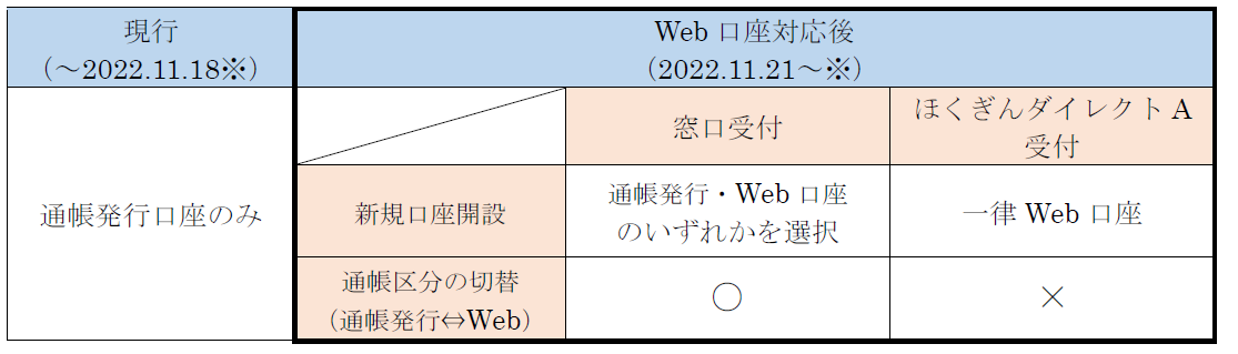 窓口での手続きが必要(今後、インターネットバンキング「ほくぎんダイレクトA」での受付も予定しております)
