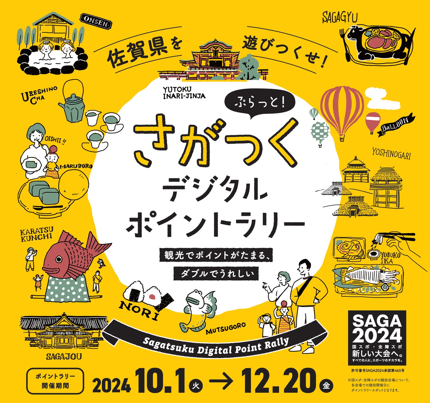 一般社団法人佐賀県観光連盟(会長:佐賀県知事 山口祥義)では、県内観光施設への誘客拡大と、県内周遊観光の促進を図ることを目的とした、「ぷらっと!さがつく デジタルポイントラリー」を開催します。