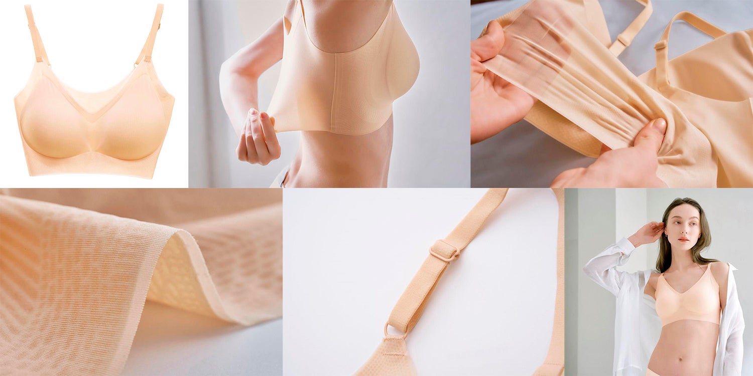 胸まわり360°シームレスで伸縮素材使用だから着脱もらくらく。リラックスしながらもしっかりと補整します。ストラップは長さ調節可能。おしゃれでムレにくいシアー素材使用も嬉しい。極薄だからアウターに響かず薄手の季節にも。