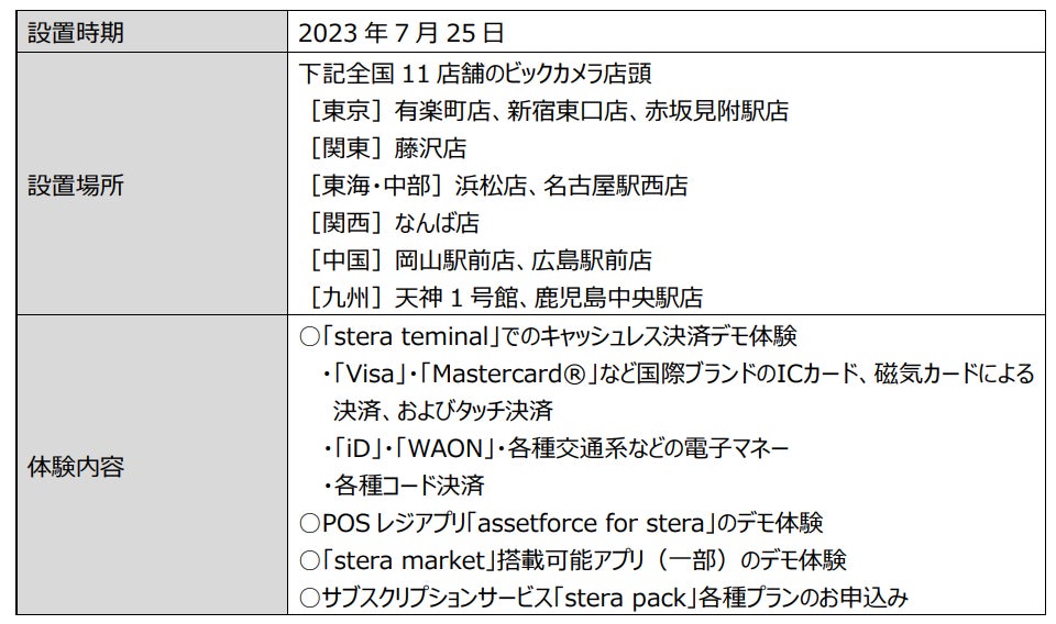 これを受け、2023年7月末より、全国11店舗のビックカメラ店頭に、三井住友カードのオールインワン決済端末「stera terminal」体験ブースを設置いたします。より多くの事業者の皆さまに「見て、触って、試して」いただくことで、「stera terminal」の魅力を感じていただける機会を提供いたします。