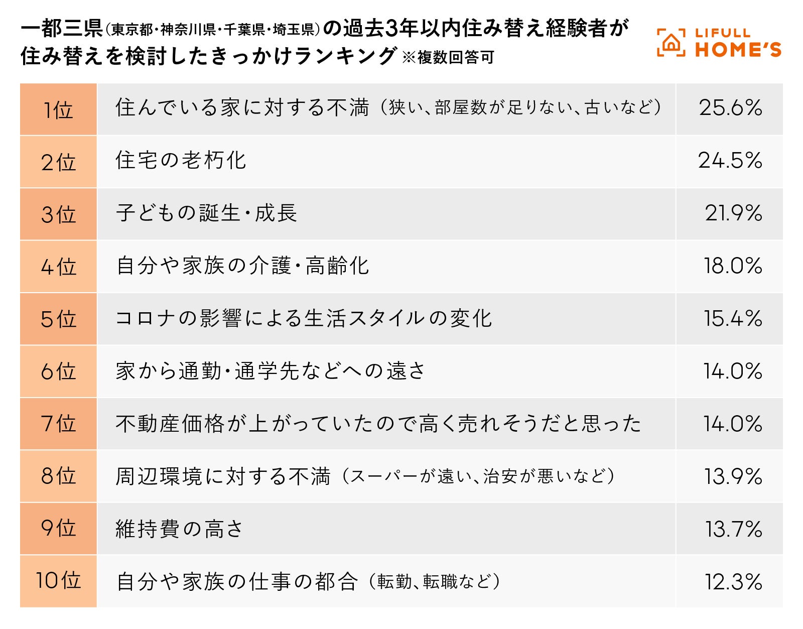 住み替えを検討したきっかけについて聞いたところ、「住んでいる家に対する不満(狭い、部屋数が足りない、古いなど)」(25.6%)、「住宅の老朽化」(24.5%)といった現在の住居に対する不満が上位に上がる一方で、「子どもの誕生・成長」(21.9%)、「自分や家族の介護・高齢化」(18.0%)といったライフステージの変化を理由に住み替えを検討した人も多くなっています。