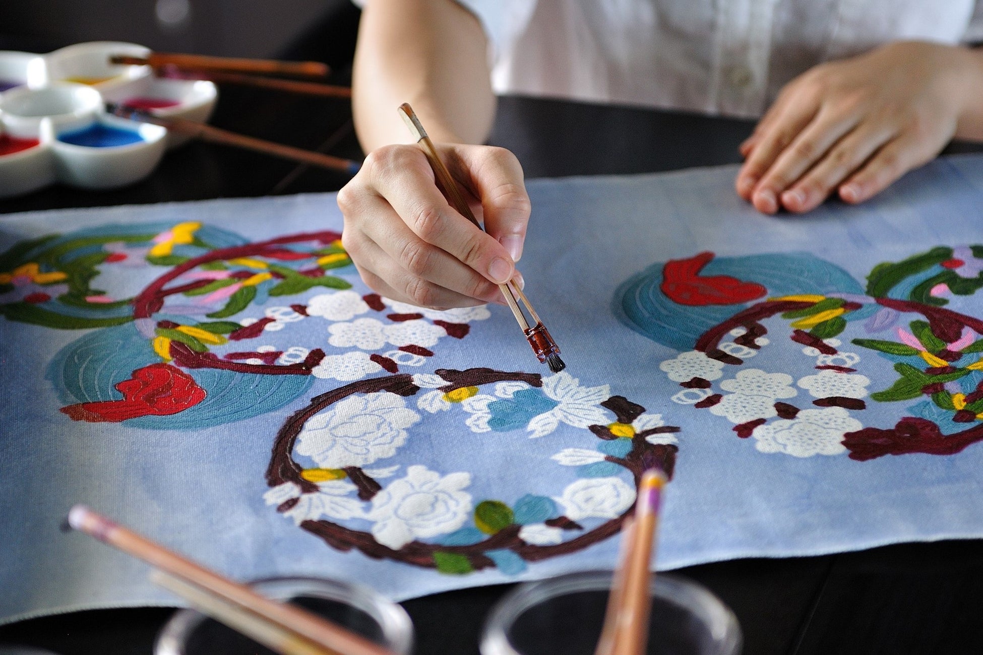 琉球王朝時代から「うちゅくい」の名で親しまれている風呂敷のような大判の布に染色を施す、紅型制作を体験します。使用する型は、梅や牡丹など祝いや祈りが込められた古典模様をモダンにアレンジしたオリジナルデザインです。幾つかある工程から、顔料を混合して染色を行う「色差し」と立体感を引き出す「隈取り」を体験します。細やかなデザインの紅型は、色が重なり滲まないように配色や筆遣いにコツが必要です。プライベート工房のように設えた特別ルームで、職人から直接手ほどきを受けながら、色の刷り込み方、隈取の色の重ね方などを聞きながらじっくりと取り組みます。