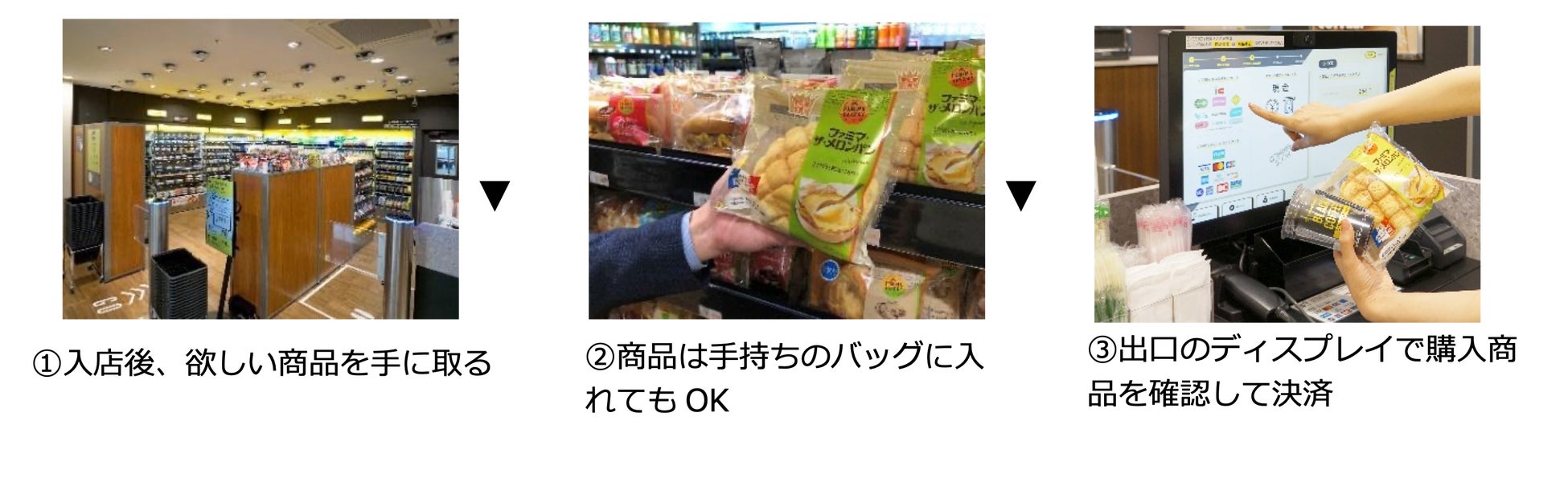 仕組みは、天井に設置されたカメラの情報から入店したお客さまと手に取った商品をリアルタイムに認識します。出口付近に設置された決済端末のディスプレイに購入商品と合計金額が自動で表示され、ファミペイを含むバーコード決済、交通系電子マネー、クレジット、現金で支払いが可能であり、スピーディにお買い物ができます。