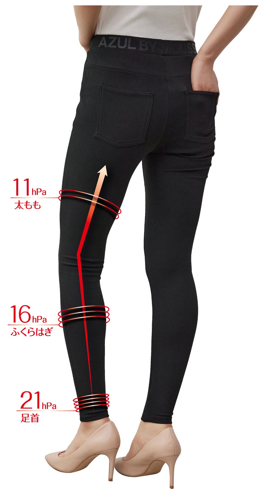 今回新発売する「SLIMWALK×AZUL 24hマルチスキニー」は、お外では洋服として、お家ではリラックスウェアとして使える万能な着圧レギパンです。医学から生まれた段階圧力設計(足首21hPa、ふくらはぎ16hPa、太もも11hPa)で、着用している間中、脚をスッキリケアするとともに、ほどよく脚を引きしめて美脚に魅せます。ストレッチ素材で動きやすく、お腹まわりはゆったりとした設計で就寝時も快適です。カラーは、BLUEとBLACKの2色を展開します。
