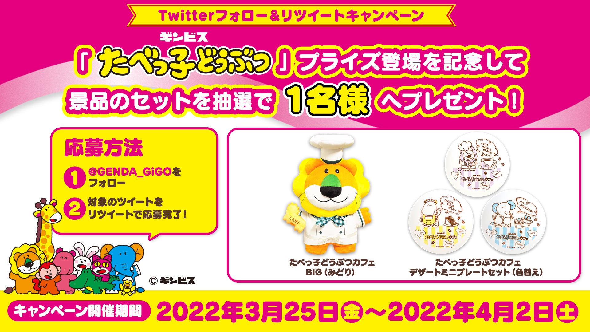 Twitterアカウント(@GENDA_GiGO)をフォローの上で、該当のツイートをリツイートされたお客さまの中から抽選で1名様にたべっ子どうぶつ景品セットをプレゼントいたします。
