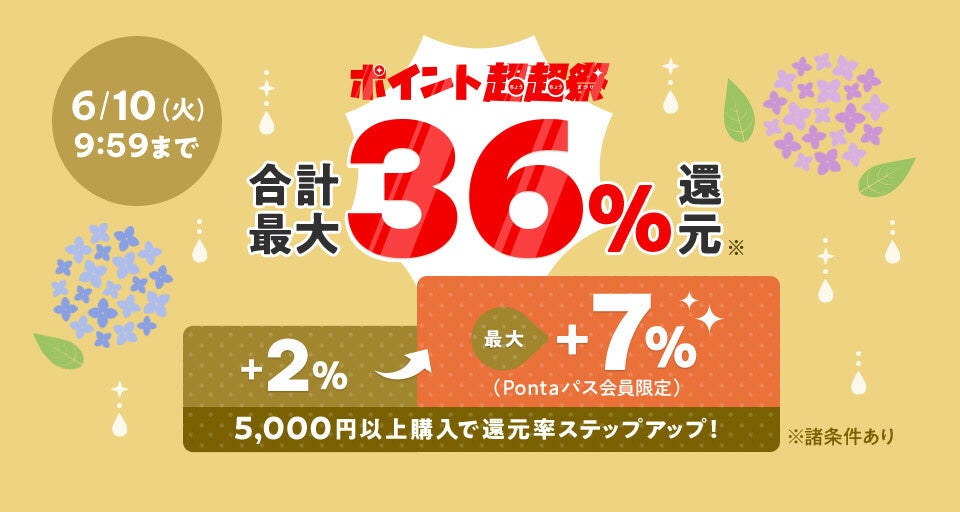 〈ポイント超超祭〉最大7% 〈買い得メンバーズ〉最大10% 〈店舗からのポイント〉最大19% 【合計】 最大36% |